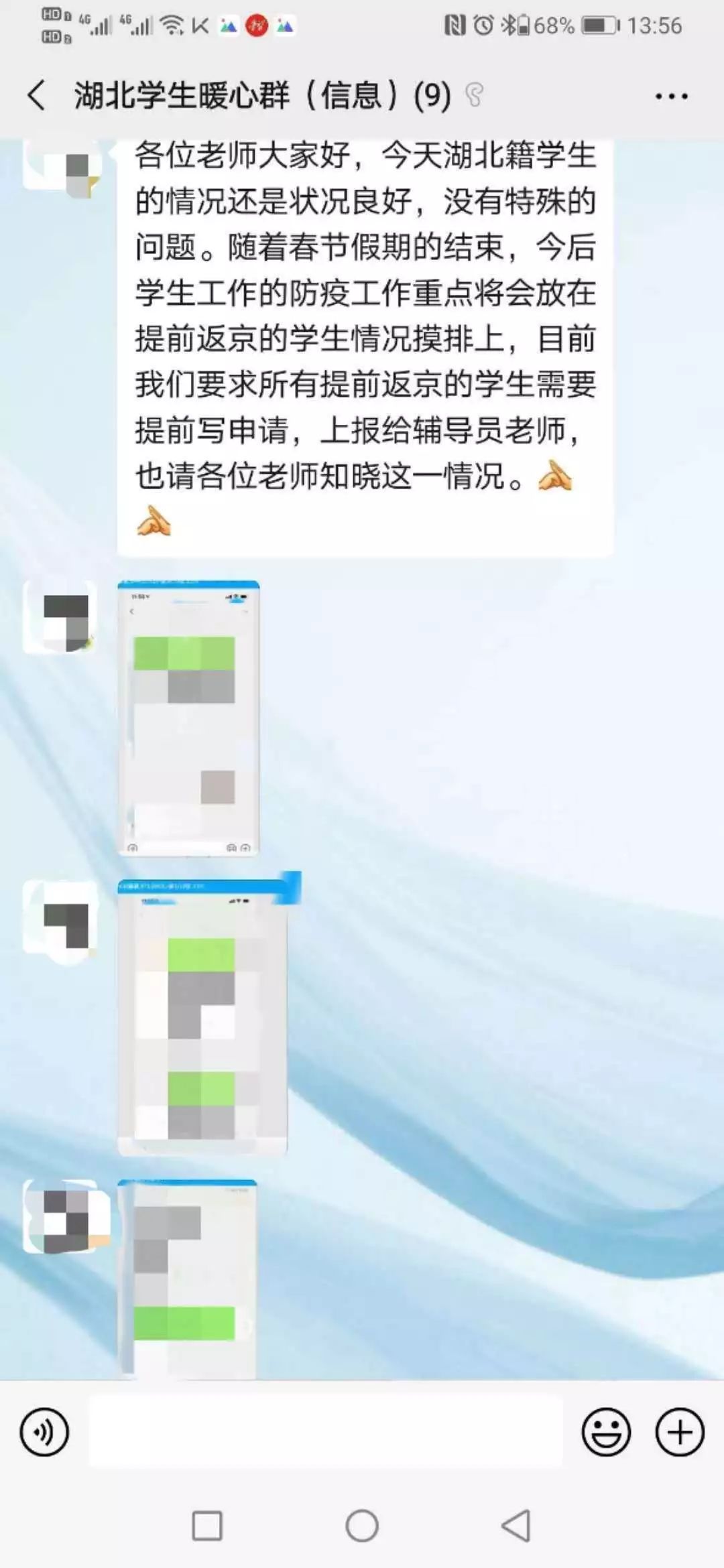 學(xué)部目前有8人學(xué)生在湖北地區(qū),支部為每名學(xué)生配上負(fù)責(zé)教師,堅(jiān)持每日以支部名義為他們送上一句問(wèn)候、一份祝福,對(duì)于學(xué)生遇到的其他問(wèn)題老師也一一給與幫助。
