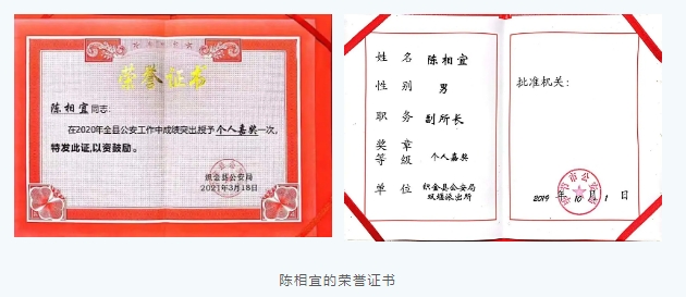 多年來,陳相宜辦結各類治安類行政案件300余起,行政拘留400余人,其中包括拘留和強制戒毒人員220余人,破獲販毒、故意傷害、尋釁滋事、聚眾斗毆、盜竊、搶劫、強奸等刑事案件110余件,刑事拘留130余人,為維護當地社會穩定和保護人民群眾生命財產安全做出了積極貢獻。作勁頭后,總會善意地提醒,面對危險不要太拼,他也總會笑著安慰說“放心吧”,但是再次遇到危險他又變成了那個“拼命三郎”。“身為一名警察,我深知肩上的責任和擔當,遇到危險沒有退路,只能勇往直前,要對得起自己頭上的警徽”。